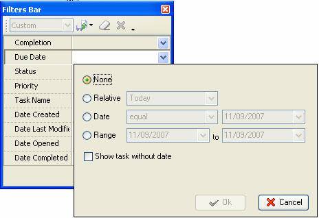"Filter by Due Date" allows you filter the tasks by their due date in relation to required time and date or time interval.