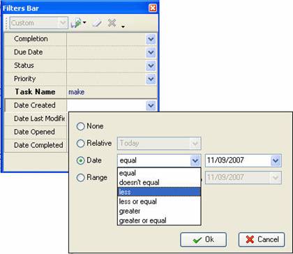 "Filter by Date Created", "Filter by Date Last Modified", "Filter by Date Opened" and "Filter by Date Completed", allow you to filter tasks by the date when they were created, last modified, opened and completed correspondingly in relation to required date and time or time interval. |