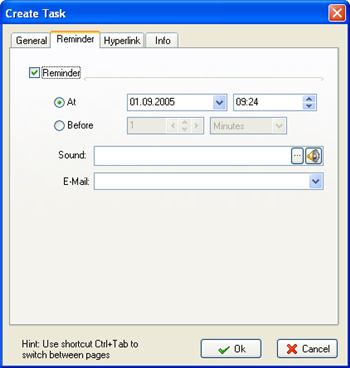Also you can choose the sound file to be played with the reminder and e-mail, you want reminder to be sent to.