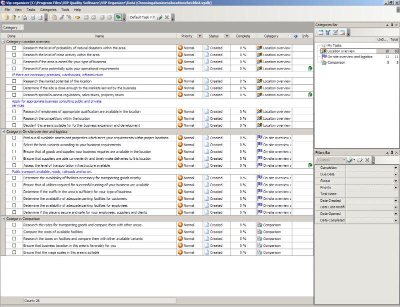 Choosing a business location checklist is intended for research and consideration of a wide range of factors which support your business or can influence it. This checklist includes the number of points which should be gone through to ensure proper assessment and selection of location for your business. Of course this checklist cannot include all possible factors and circumstances, so it can be easily altered and elaborated to fit more specific requirements. SMART planning checklist