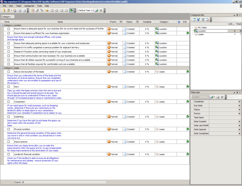 Renting a business location checklist consists of items that briefly describe questions which should be considered when you want to rent a space. It consists of the positions which are dedicated for space inspection and the most common issues that need to be considered when negotiating for a lease. This checklist cannot cover all possible issues and questions, so you can elaborate and easily modify it according to your specific needs. SMART planning checklist