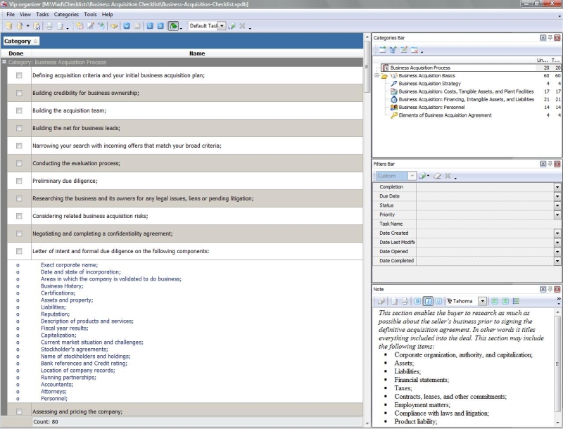 This Business Acquisition Checklist can be helpful to those entrepreneurs who consider buying (or selling) a business as a way to start or extend their own one. With an enterprise acquired you may get not only its existing assets and reputation, but also a bunch of problems to resolve. With a help of this checklist you can learn the process of acquiring, aspects to analyze on the pre-purchase due dilligence, and sections to be included into business acquisition agreement. Business Acquisition Checklist