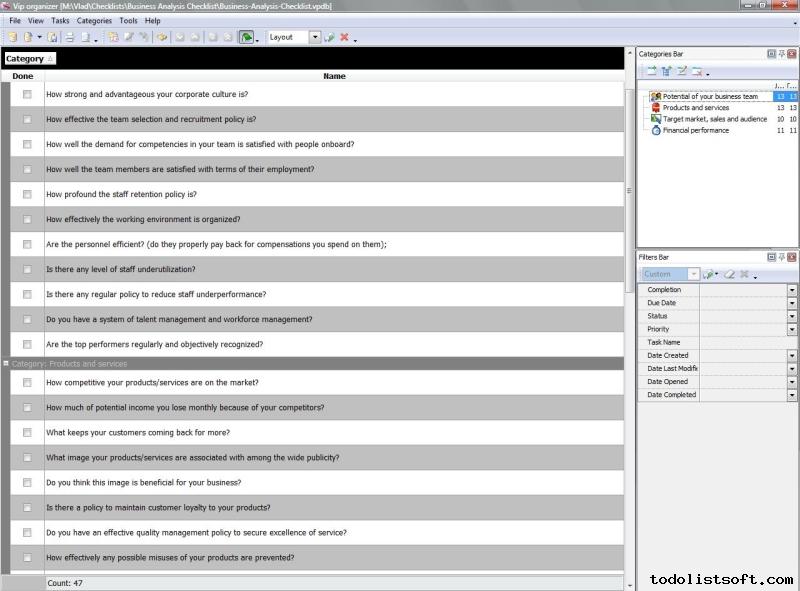 Business Analysis Checklist is a tool helping you to review competitiveness and strengths of your company. With a help of this checklist you can review what robust resources are available to your organization, especially among the critical success areas: your business team, current products and services, marketing and financial performance.   Business Analysis Checklist