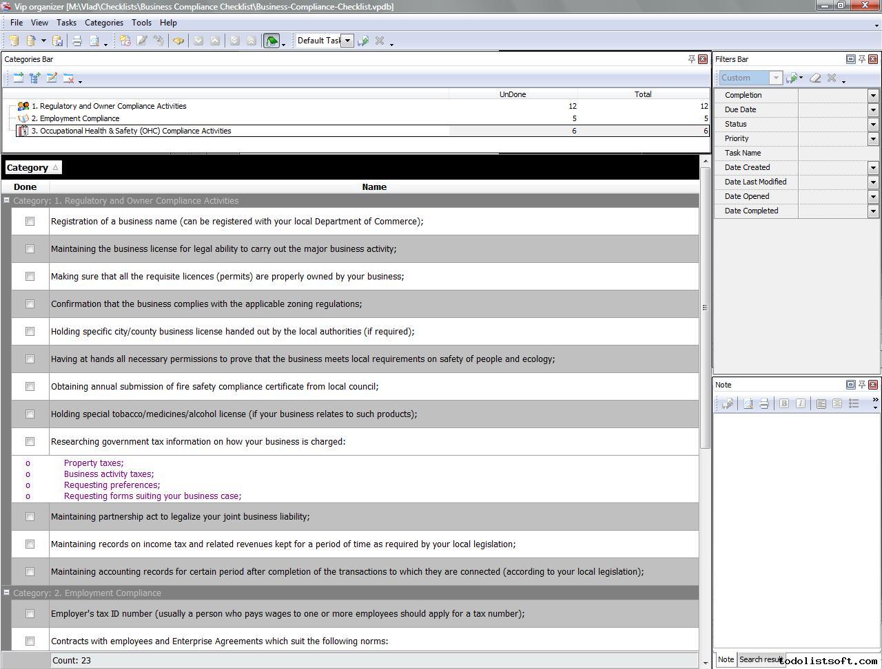 Business Compliance Checklist is created for people who wish to make sure that their businesses are fully compliant with local regulations and legislative requirements, so they can keep working freely and adequately in all spheres including business registration, employment and safety. Business Compliance Checklist