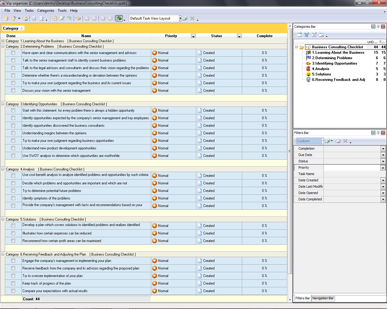 This Business Consulting Checklist is designed for consultants and advisors who need to understand what steps can be taken to investigate an organization and get insight into business problems and opportunities. It includes guidelines for conducting a business analysis and developing an improvement plan.   Business Consulting Checklist