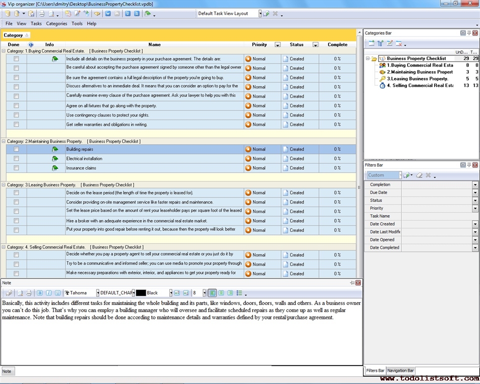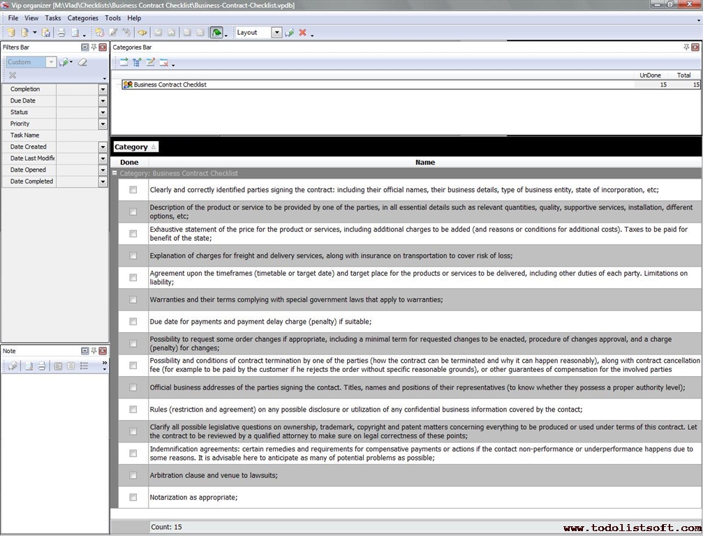 This Business Contract Checklist is created to assist people in documenting their deals to be clear and understandable for all parties involved. With a help of this checklist you can make sure that a contract contains enough of information to make your deal clear and effective in terms of goods and services to be provided, terms of payment and other essential issues.   Business Contract Checklist