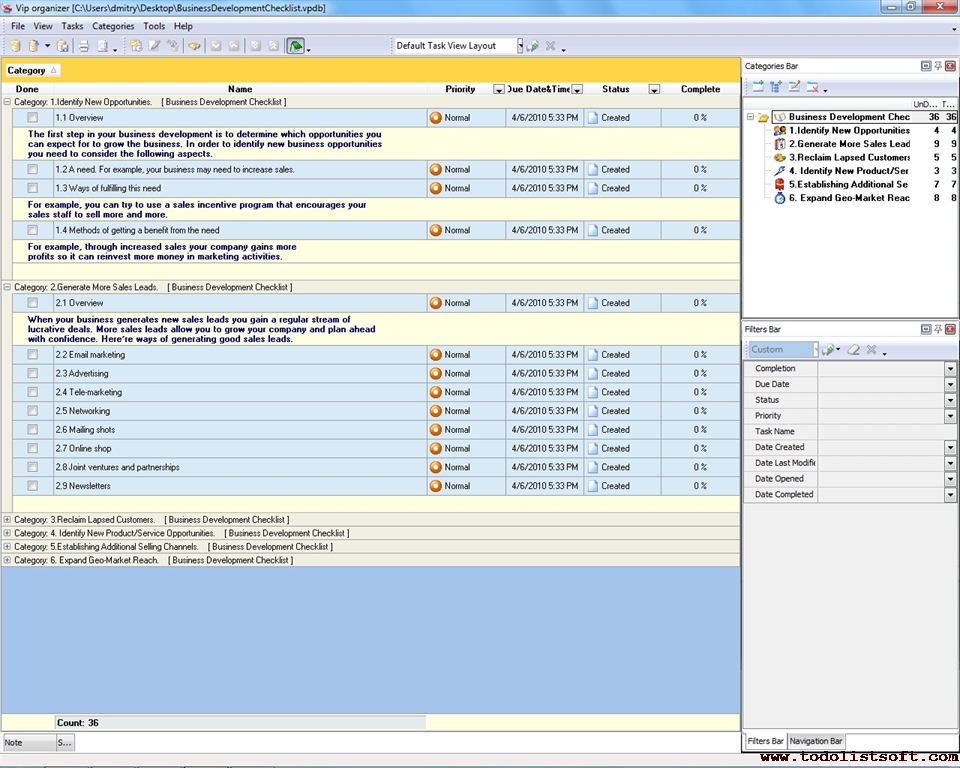 This Business Development Checklist describes six key steps that you can take to grow and develop your business. The Checklist also includes suggestions on how to take each of the steps. You can use it as an additional source of valuable information for planning your marketing plans, sales activities and development initiatives. Business Development Checklist
