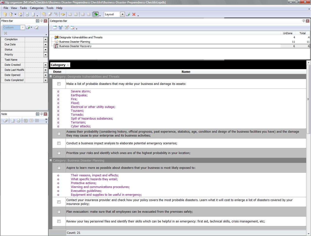 This Business Disaster Preparedness Checklist will be helpful to all business owners who wish to get ready for possible hardships caused by emergency: ceasing their business operations temporarily and possible business relocation, planning safety and survival of their employees and infrastructure, and then, once a disaster quiets down, recovering their business. Business Disaster Preparedness Checklist