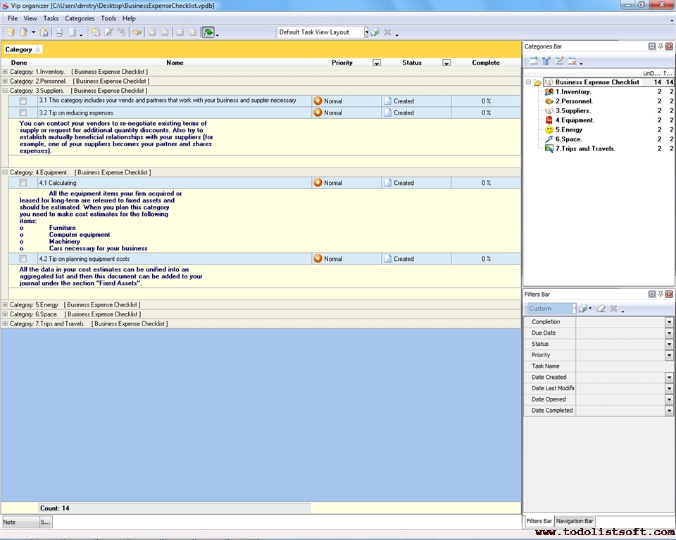 This Business Expense Checklist presents the key categories of costs that you need to consider when estimating expenses and planning for budget. The categories are Inventory, Personnel, Suppliers, Equipment, Energy, Space and Travel. The checklist also gives guidelines and tips that help reduce business costs. Business Expense Checklist