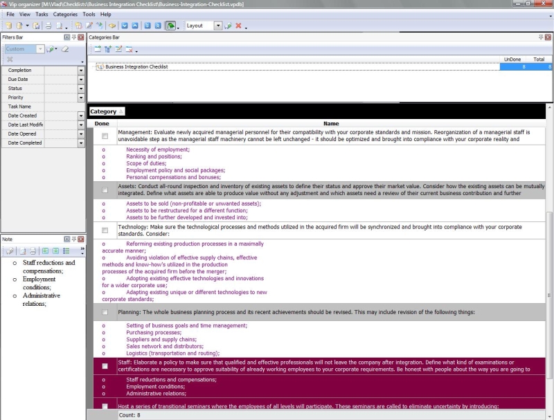 This Business Integration Checklist is created to support company managers who are in charge of integration an acquired company into their enterprise (accomplishing a business merger). With a help of this checklist you can obtain a clear idea of aspects that need to be involved into integration process. Business Integration Checklist