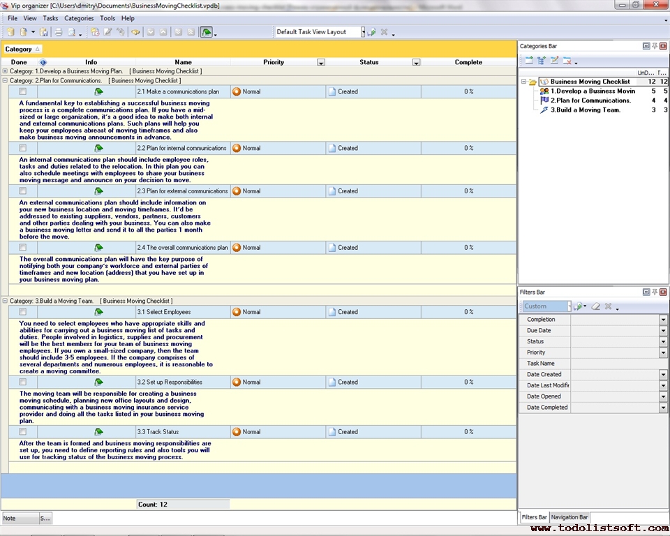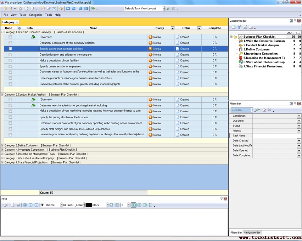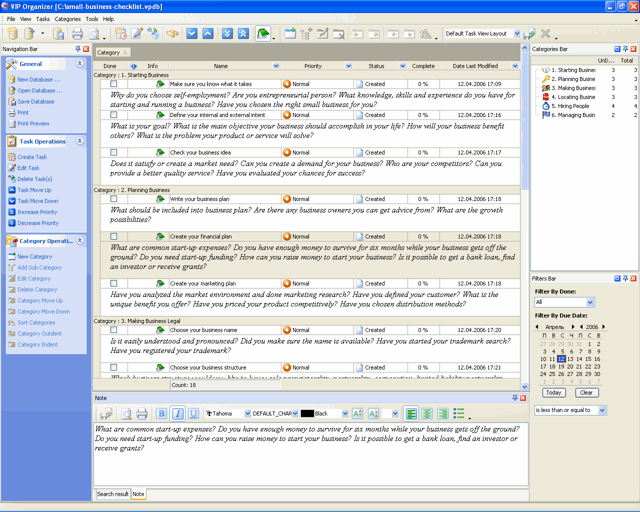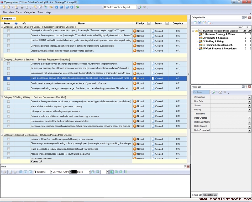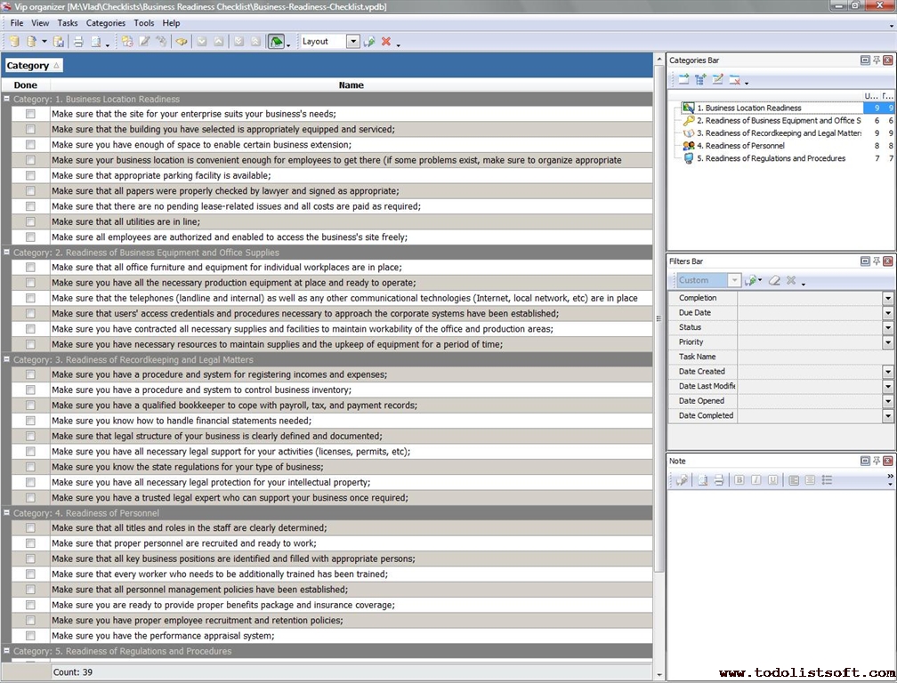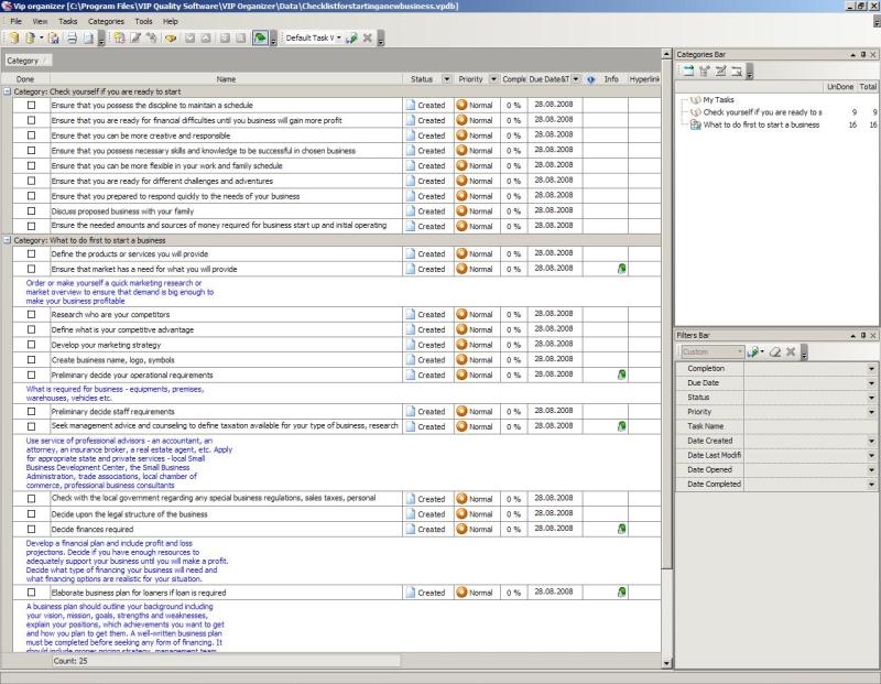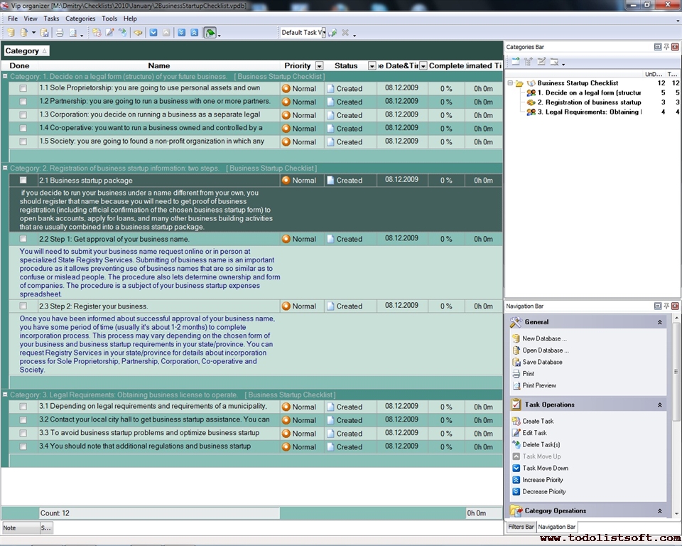 It's not an easy thing to develop and follow your business startup list of tasks. To make such a list, you need to gain an understanding of legal structures, business registration requirements, business startup services, licensing procedures etc. To learn about various legal structures (forms), registration of business names, obtaining business licenses, and getting business startup support information, please read Business Startup Checklist.