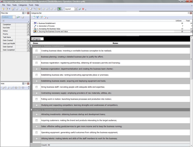 This Business Operations Checklist is created for people who would like to start up a business. It comprises a wide scope of business operations and functions which need to be maintained to keep your enterprise running, developing and secure.   Business Operations Checklist