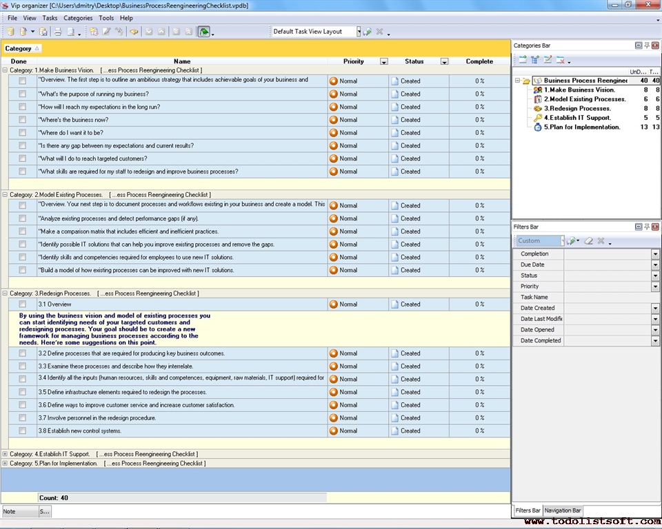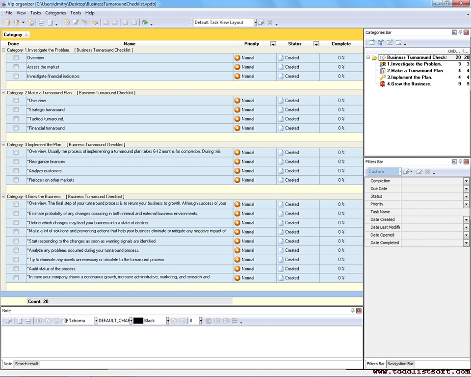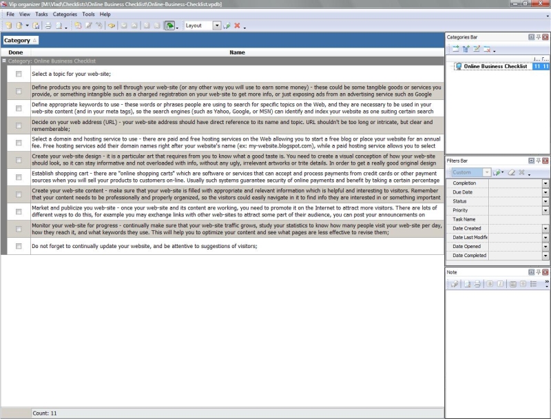 This Online Business Checklist is designed to provide help to all individuals who wish to obtain an action plan for establishing a web-based business solution. With a help of this checklist you will get an all-round review of how such an effort is started and managed.    Online Business Checklist