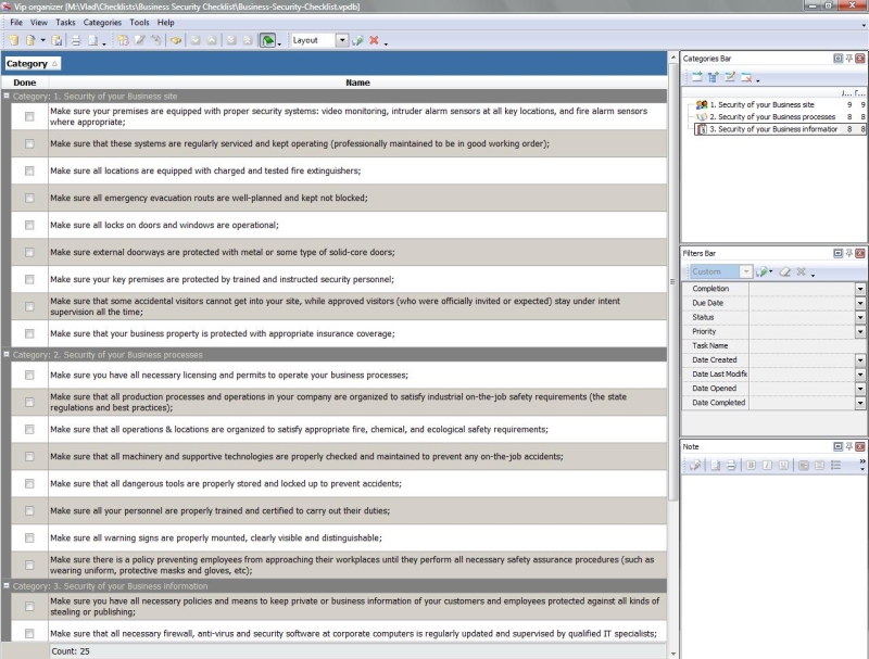 This Business Security Checklist is designed to help business owners and managers in protecting their enterprises against different kinds of threats. With a help of this all-round checklist you will know what needs to be done at your business site, processes and informational transactions in order to secure them against the most common menaces. Business Security Checklist