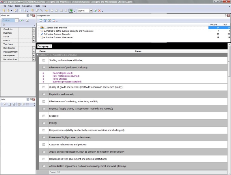 This Business Strengths and Weaknesses Checklist is designed to support business manager who would like to honestly and realistically assess strong and weak traits of his or her enterprise. With a help of this checklist you can know a set of aspects to be analyzed, along with some strengths and weaknesses to be identified.  Business Strengths and Weaknesses Checklist