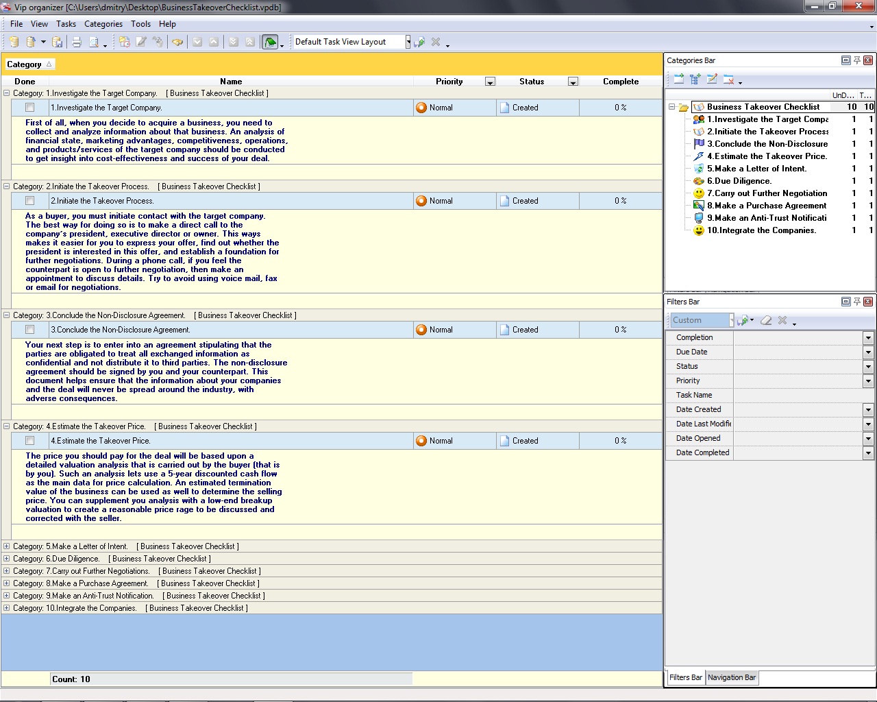 Business takeover is one of the ways to own a small company. It is a procedure of acquiring an organization and integrating this organization into an existing business entity. Ten common steps of the procedure are described in this Business Takeover Checklist. Business Takeover Checklist