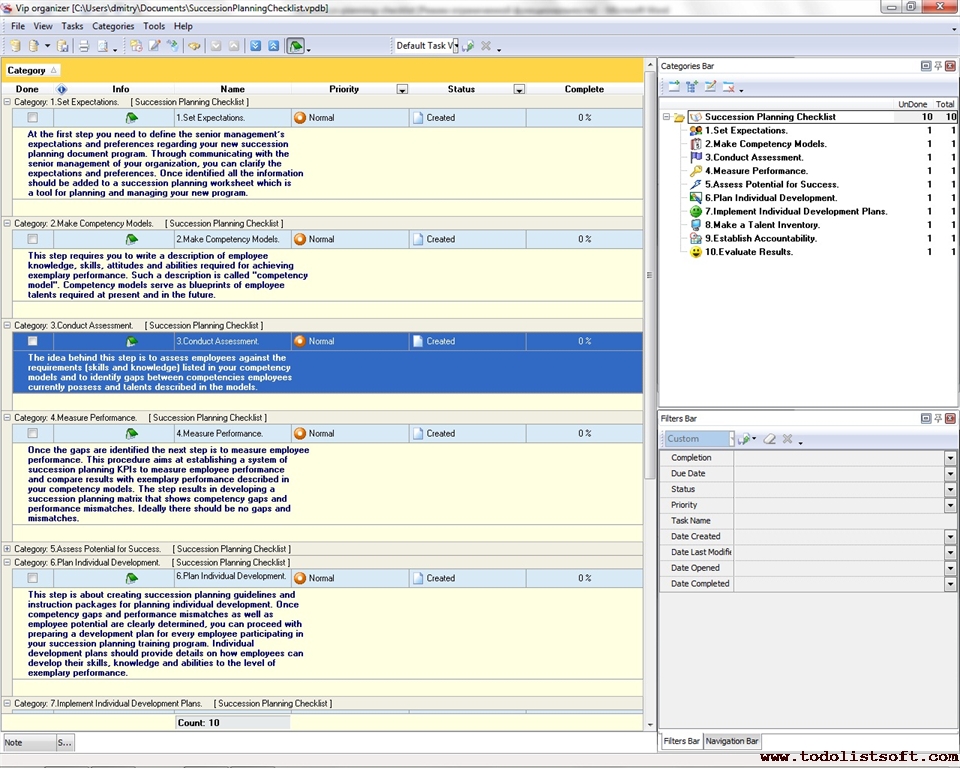 This Succession Planning Checklist gives a description of the 10-step process for planning and managing a succession program in business organizations. The checklist will be helpful for top managers, business planners and analysts who treat for performance management and employee development. Succession Planning Checklist