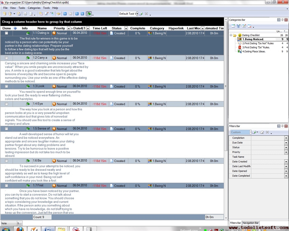 Relationships between two persons can be started from the first dating. The given below Dating Checklist can be equally useful to both males and females because it descries common ideas and tips to attract a person and prepare for a dating.