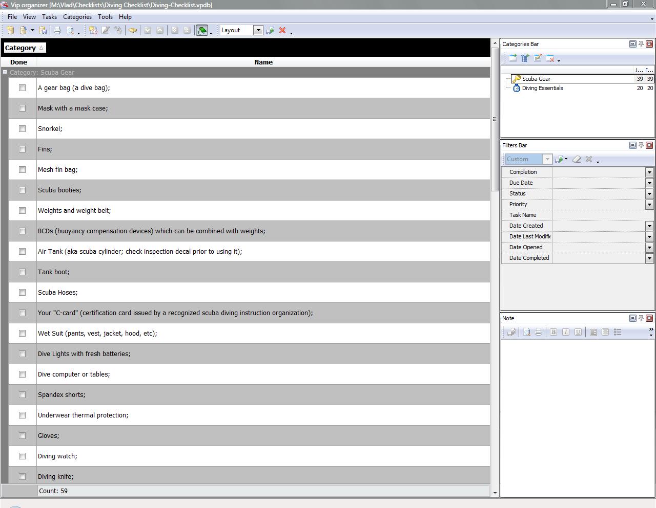 This Diving Checklist is created for all those who are going on vacations to the seashore and need a guiding document to collect and pack some scuba items to organize a good pastime with swimming, boating and diving.