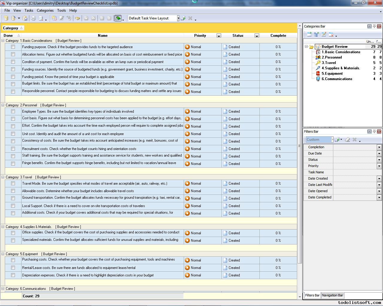 Read this Budget Review Checklist to find out how to evaluate corporate budgets. The checklist highlights the key items to be reviewed and evaluated, including Personnel, Travel, Supply & Materials, and others. It is best used with VIP Organizer software. Budget Review Checklist