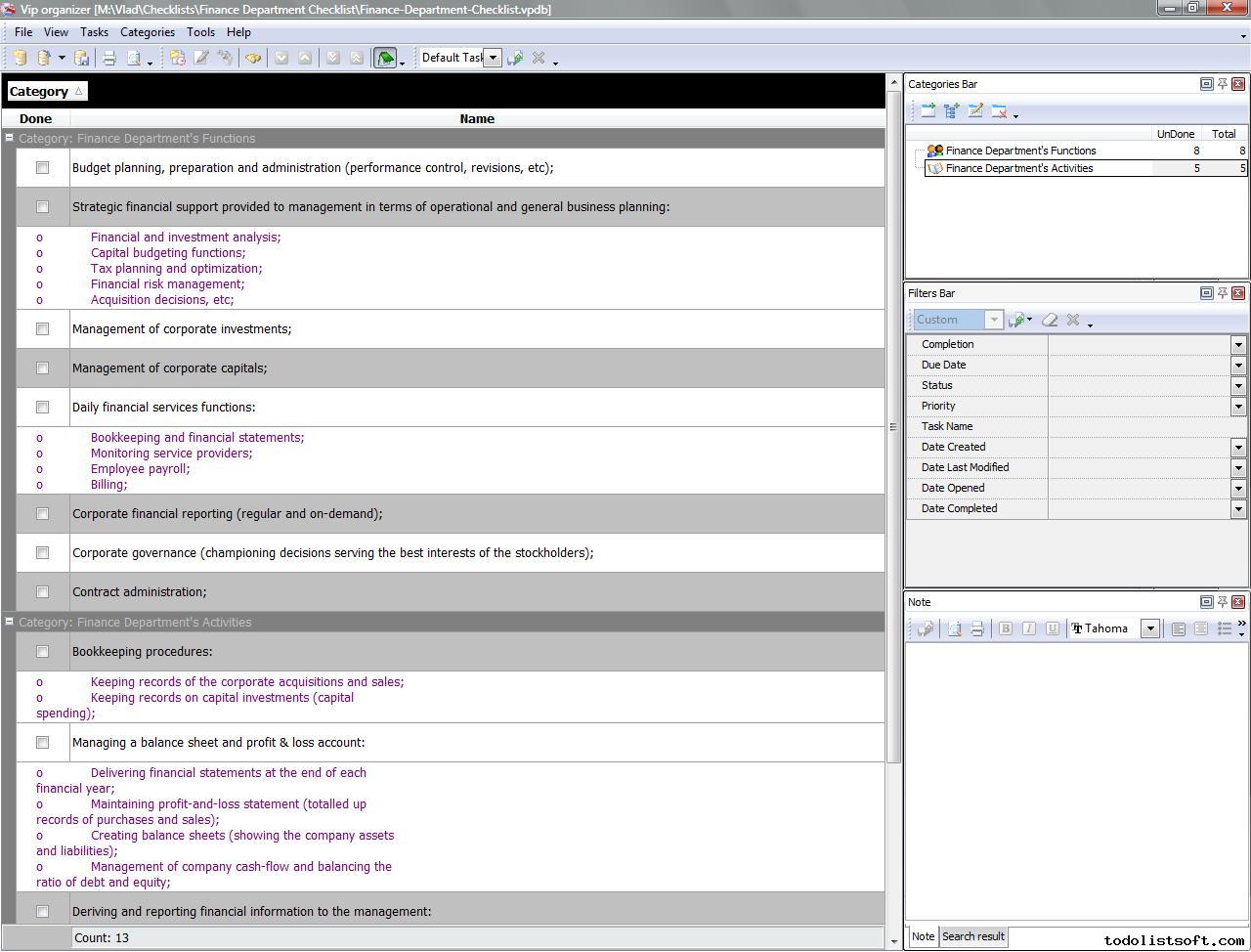 Finance Department Checklist is composed for the business administrators who want to establish appropriate departments in their companies. In this checklist you can find a list of specific functions and activities that are peculiar to financial departments (the financial and accounting affairs). Finance Department Checklist