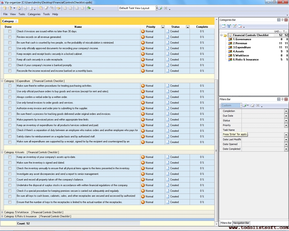 This Financial Controls Checklist includes a range of tasks you can do to check if your business organization is financially stable. Its content covers such economic aspects as governance, revenue, expenditure, assets, workforce, and risks & insurance.   Financial Controls Checklist