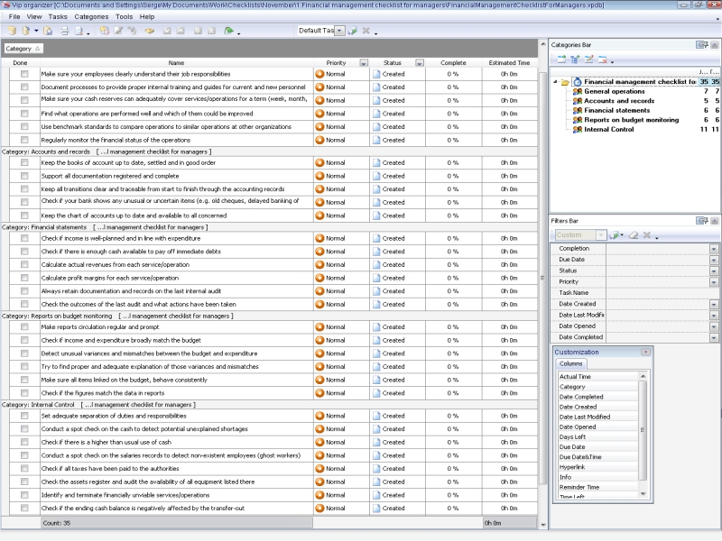 This checklist is intended to help managers and financial directors to review the level of internal control over operations and to assess the impact of any risk. It is intended that this checklist will be applied in the context of the financial management in an organization.Career Development Checklist