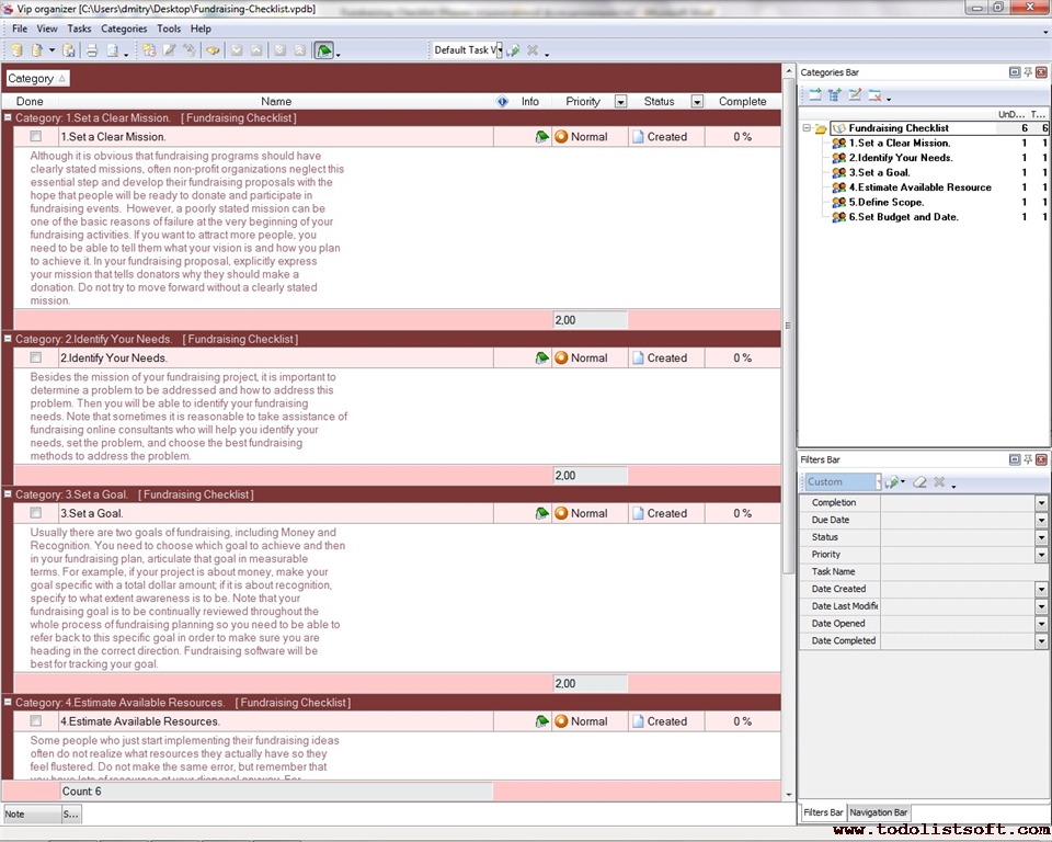 This Fundraising Checklist will help you make sure whether you have everything you need to organize a successful fundraising project. The checklist includes a set of fundraising tips and ideas to set a clear mission and goal for your project and to estimate available resources.   Fundraising Checklist