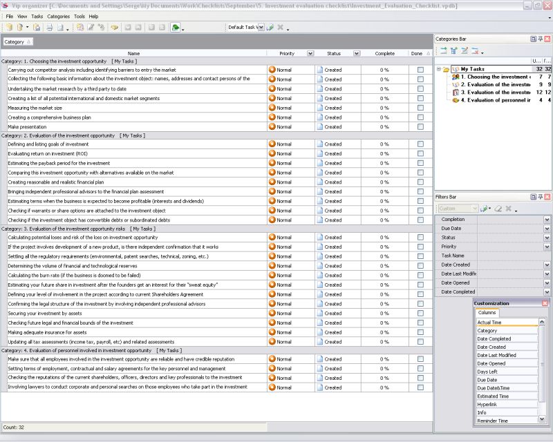 The checklist draws up concepts of selecting and evaluating an investment opportunity. It is intended to be a launching point for a more detailed and profound discussion with top management, personnel, independent advisors and other. The checklist can be applied as a model or template that individual investors should revise according to their unique processes and policies. Investment evaluation checklist