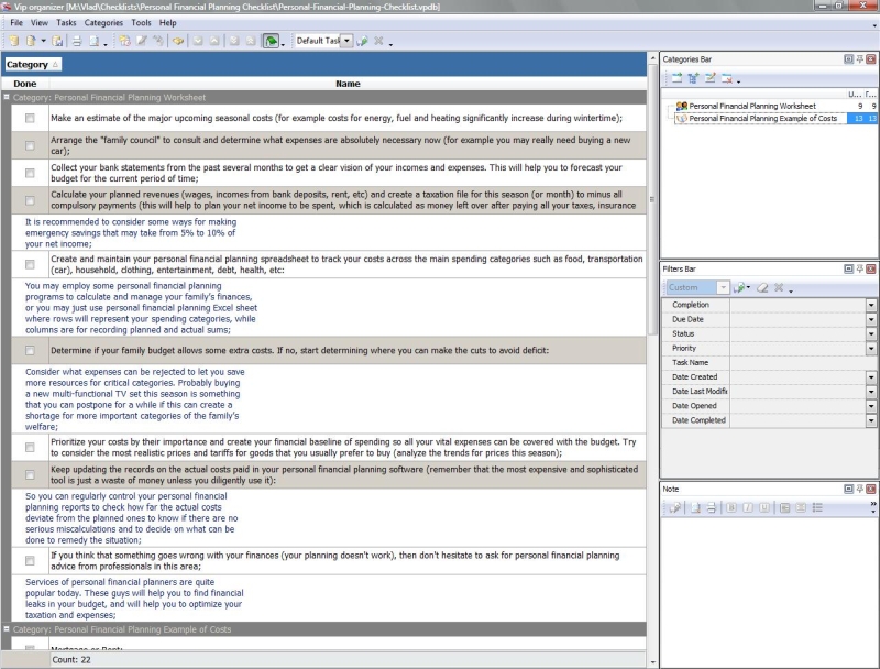 This Personal Financial Planning Checklist will be helpful to anyone who wishes to be successful with planning his/her family financial welfare, because this checklist outlines the personal financial planning process that can be followed to reach more controllability with money you earn and spend. This Personal Financial Planning Checklist gives you some examples of expenses (categories that money can be spent over). Personal Financial Planning Checklist