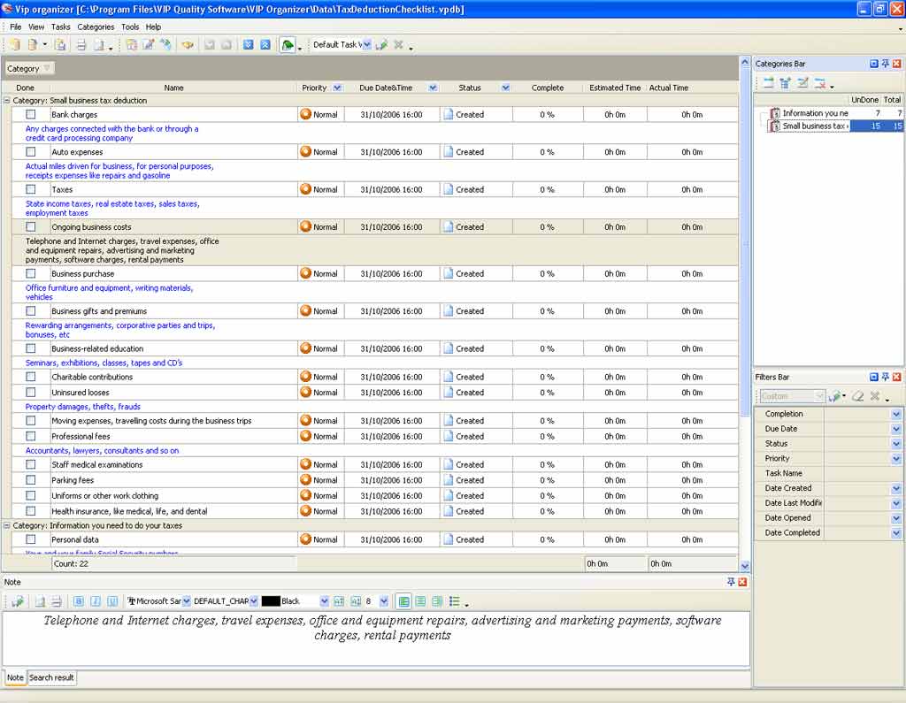 Tax Deduction Checklist is a 'to do list' for you to make all required preparations before deducting. Use this Tax Deduction template as a checklist to be tax-savvy throughout the year and not to forget all deductible incidental expenses that you paid throughout the year. Independence Day Checklist