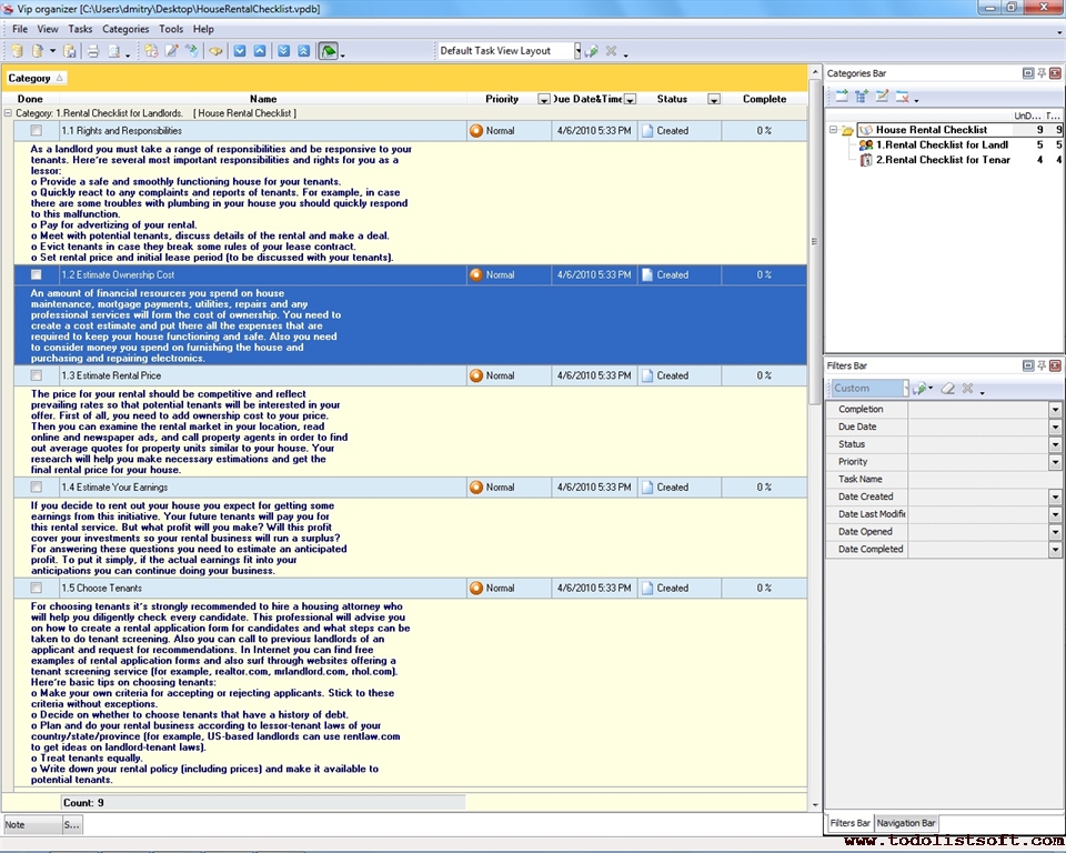 This House Rental Checklist will be helpful for landlords who want to rent out their houses, as well as for tenants who need to rent some property for a certain period of time. The checklist gives suggestions and tips on estimating ownership cost and rental price, deciding on rental requirements, etc.