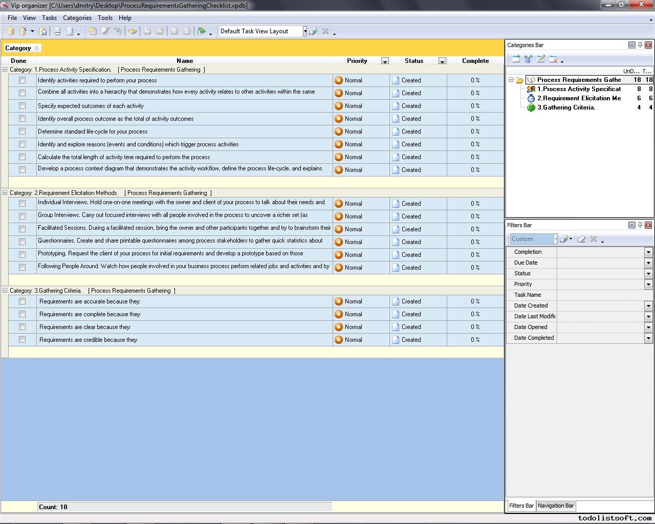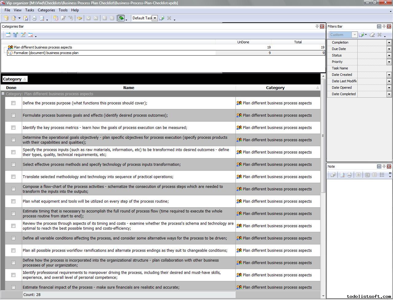 Business Process Plan Checklist is created for enterprise managers who wish to elaborate how their processes will be organized and carried out in practice. With a help of this checklist you can define elements of the process, including workforce, tangible and organizational assets, their co-operation and mutual use.
