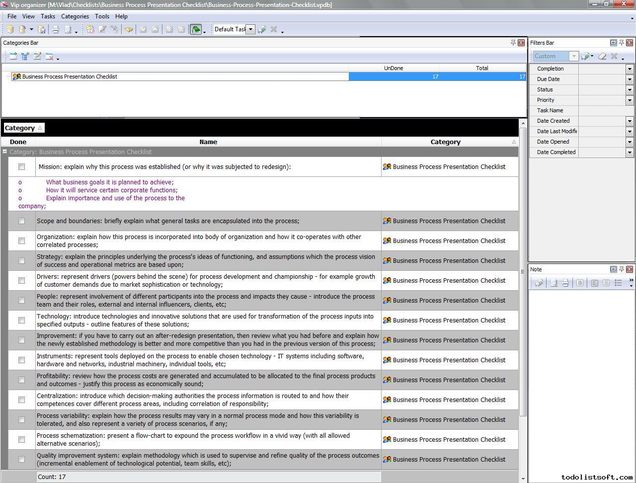 Business Process Presentation Checklist will helpful to those who wish to create a presentation of a process, whether a newly established or after it has been redesigned. With a help of this checklist you can document your process mission, strategy, drivers, and many other aspects.