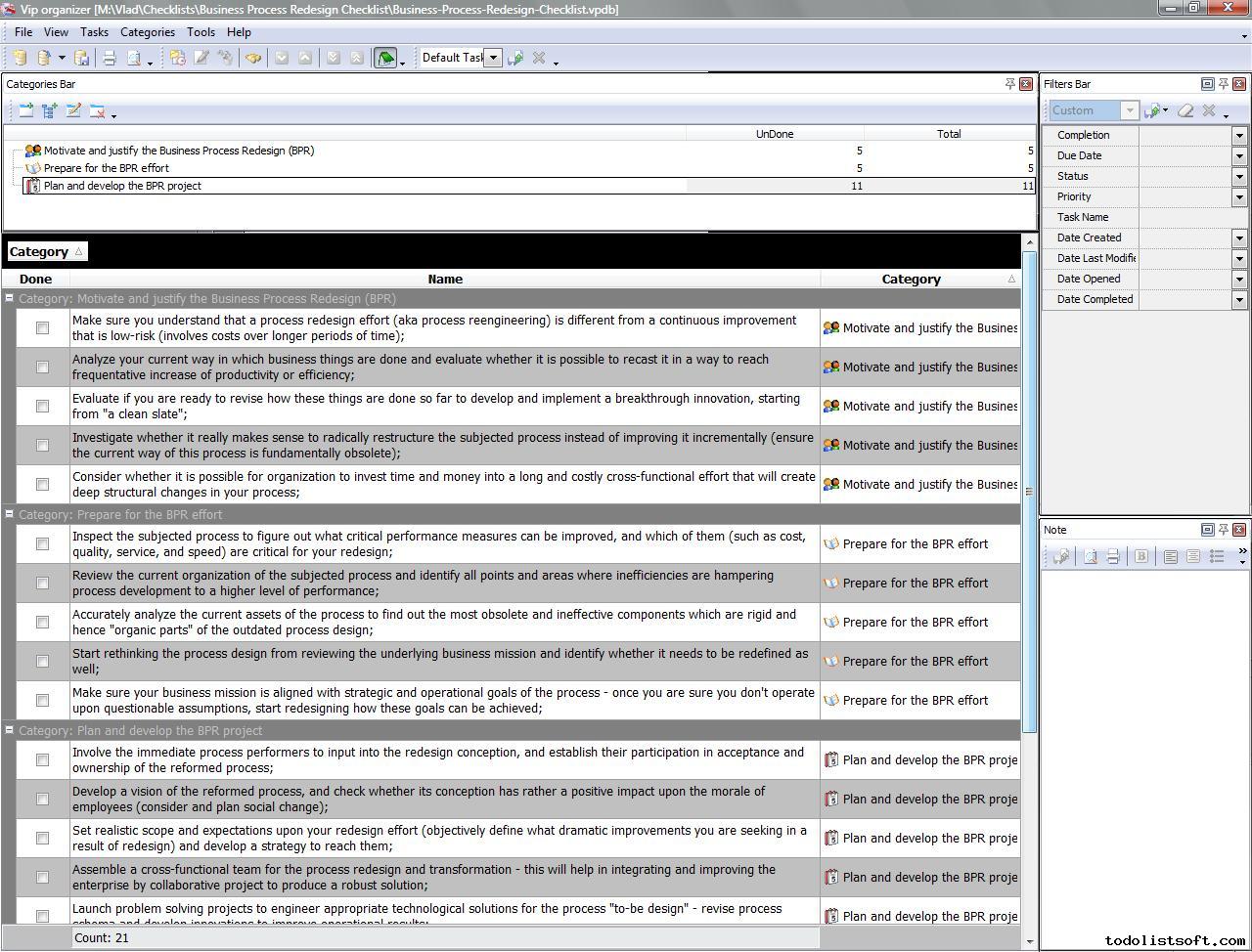 Business Process Redesign Checklist is created for business managers who wish to accomplish a reengineering project to dramatically change some of their processes to increase their yield. By help of this checklist you can justify, prepare and develop your business process redesign.