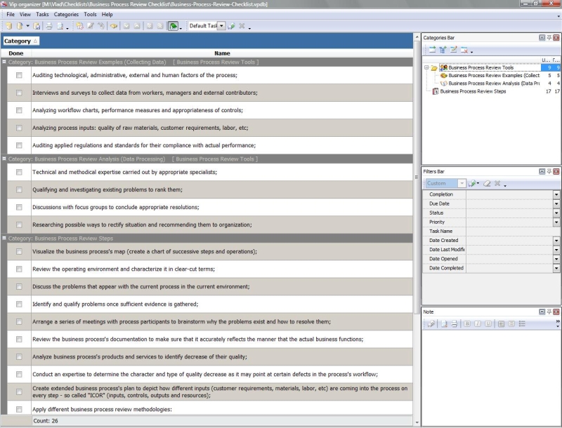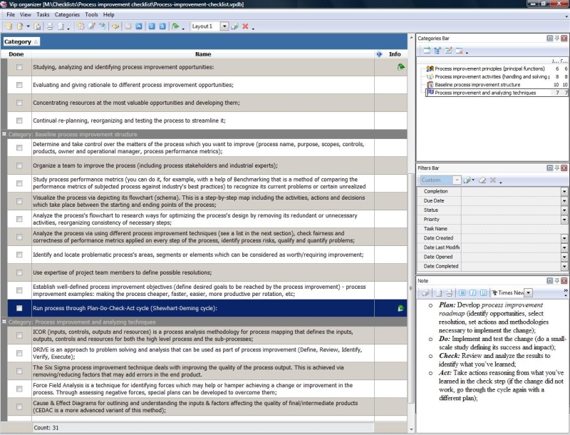 Process Innovation Checklist will be helpful to everyone who seeks new ideas for improving his or her business processes through implementing new approaches and methods. With a help of this checklist you will discover a bunch of areas where you can find some fresh opportunities.