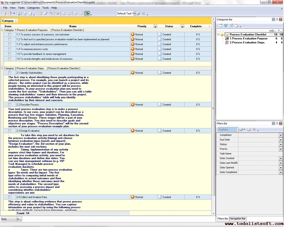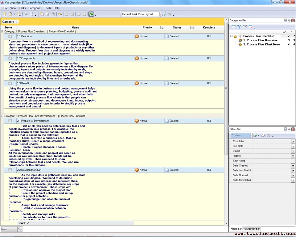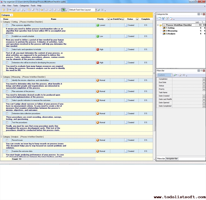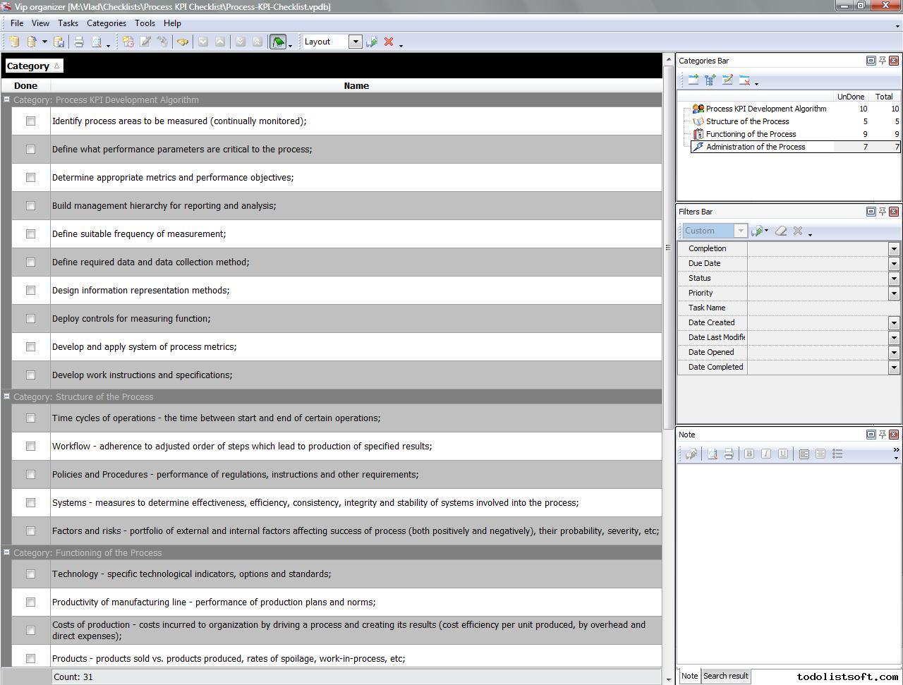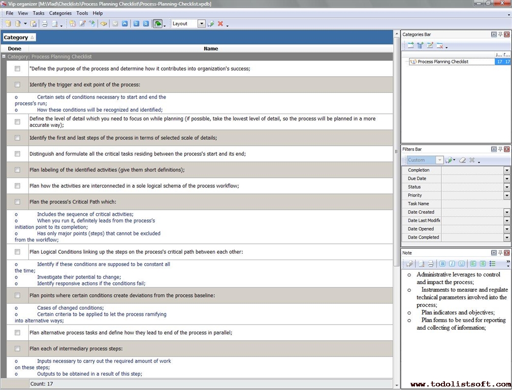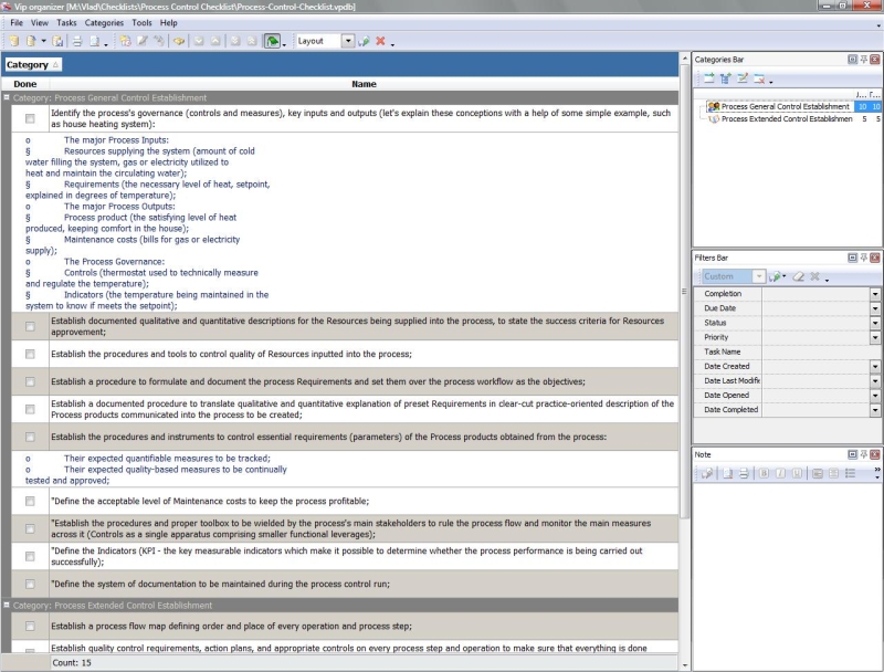 This Process Workflow Checklist describes three steps for performing a typical process workflow. It will be helpful for various specialists involved in process planning and management. The checklist can be uploaded into VIP Organizer which is a task management program.