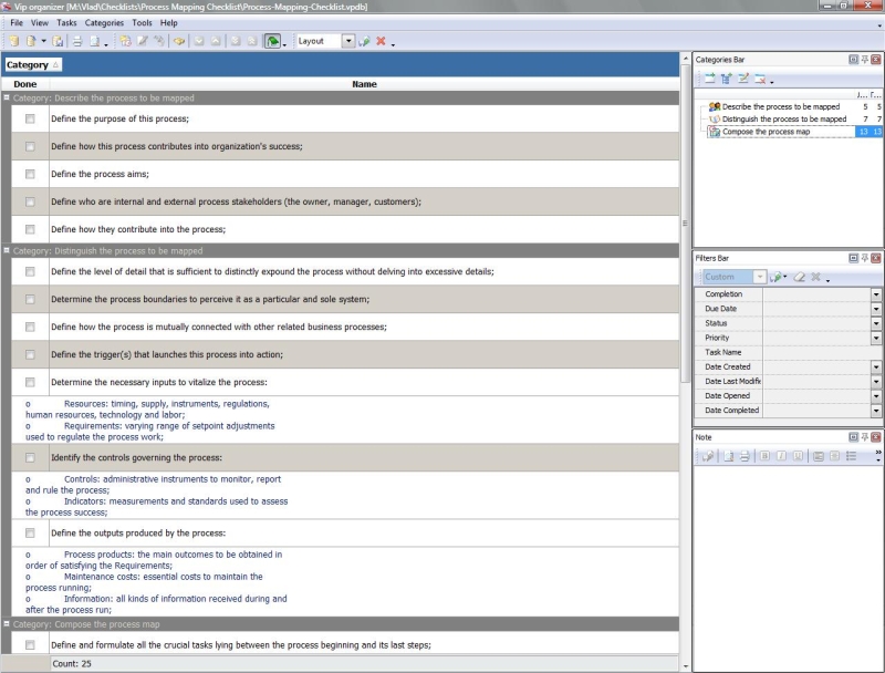This Process Mapping Checklist is created to help business researchers and managers in creating maps of their business processes in order of optimizing and improving them. With a help of this checklist you can obtain a better vision of your processes through depicting them to consider their risks, deliverables and workflow.
