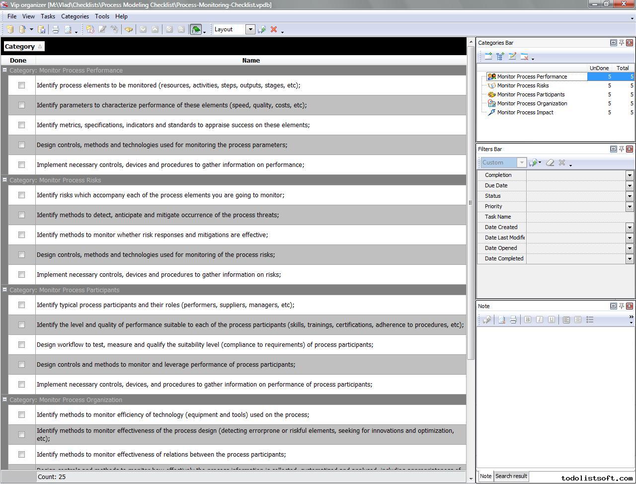 Process Monitoring Checklist is created for business managers who need to keep their processes under accurate control. With a help of this checklist you can prepare an effective schema of process monitoring, including areas of process performance, impact, participants, organization and risks.