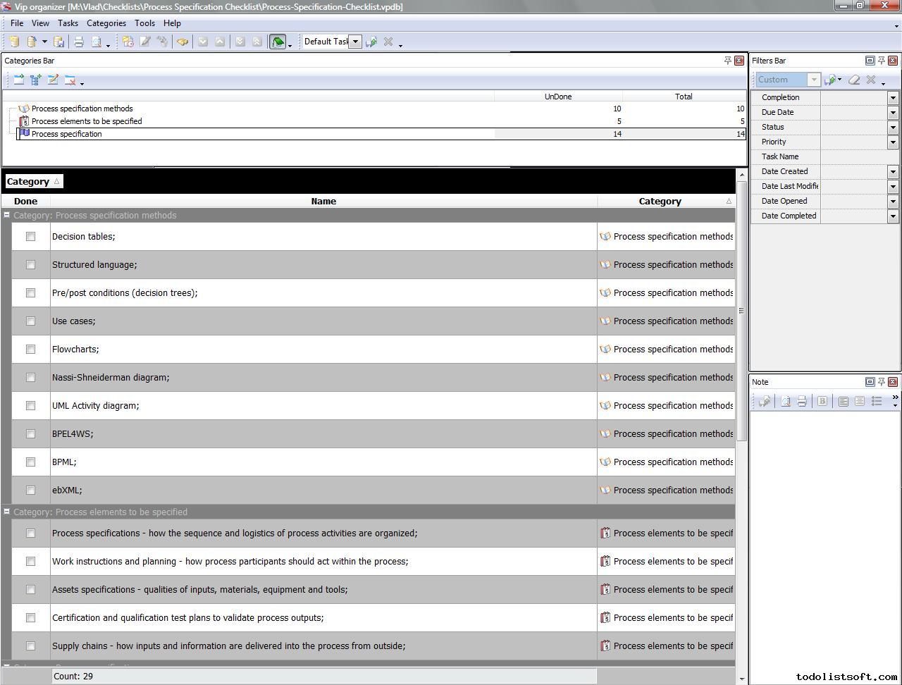 Process Specification Checklist is composed for managers who need to describe processes in order to increase their organizational incorporation and ensure successful functioning. With an aid of this checklist you can specify your processes to make them more manageable.