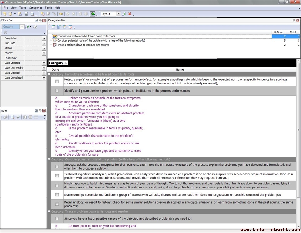 This Process Tracing Checklist is created to support process managers who have detected some problems in performance level of their supervised processes, and therefore need to drill down to find underlying causes of the problem. With a help of this checklist you will know how to formulate a problem, how to consider its roots, and then how to trace it down to resolve.