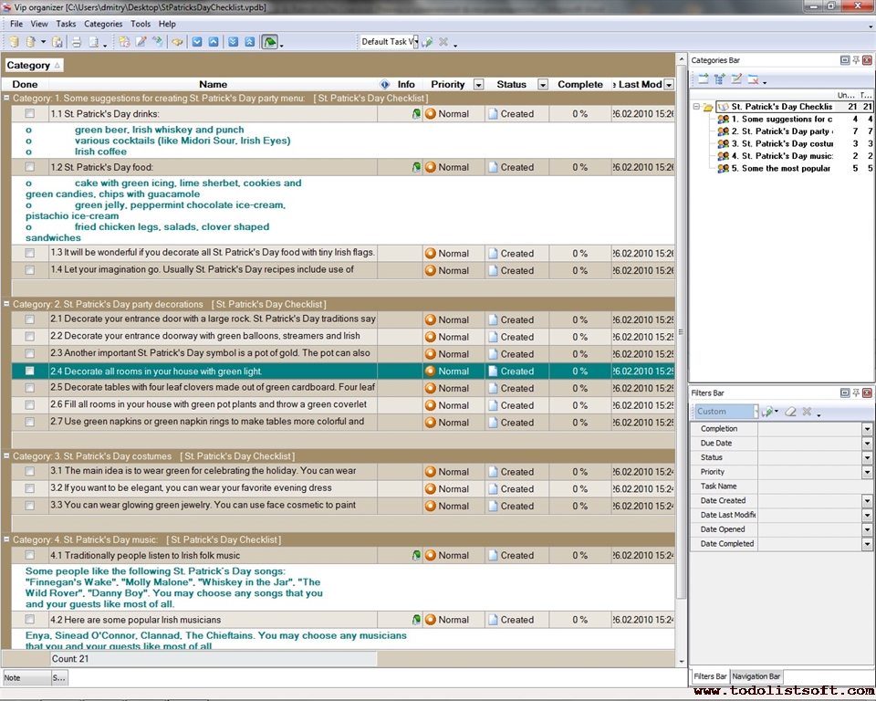 St. Patrick's Day is one of the most amusing and interesting parties for both children and adults. The given below checklist will help you be prepared for celebrating events. It offers the most popular games and gives some suggestions to create party menu. Also it suggests themes to decorate your house and rooms.