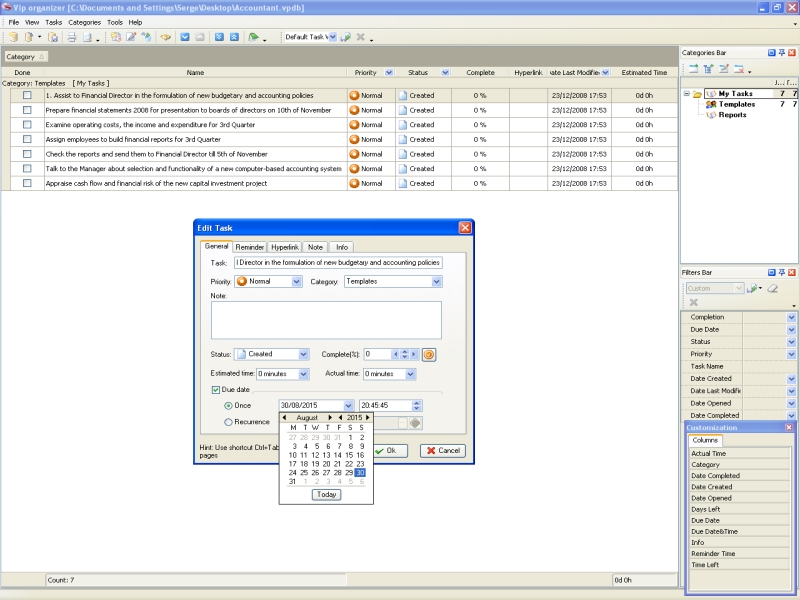 Task and categories are the building mechanism which helps organize the workflow of the accountant. Daily tasks and duties should be organized into categories. This will allow the accountant to plan his work better and create a structured list of tasks. Task management software can be used as a daily organizer which allows to create categories and subcategories for the tasks of the accountant. For example, to the category "Reports" he can add a new subcategory "Financial report for the 3 rd Quarter". In this subcategory the accountant can specify tasks necessary for building the financial report.