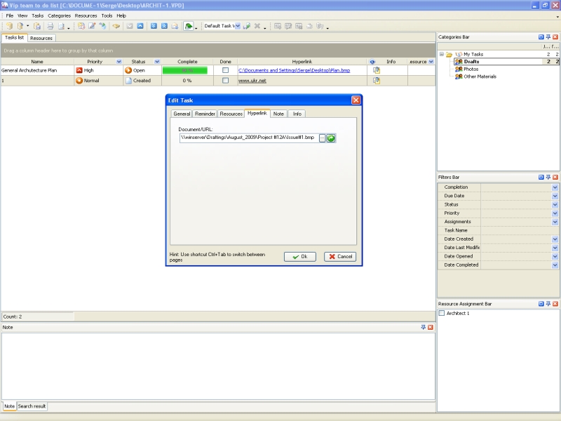 Integral part of architect's workflow is drawings, schemes and photos. The architect uses these materials for processes of planning, designing and constructing. To improve task performance, he can attach materials to task as files and hyperlinks. In task management software the column "Attachment" will display the link or file path to the drawings or schemes in the task list view. The architect can open the file in one click and continue to work with the attached materials. If the architect works in the team, he can share his drawings with the team leader by giving the access to his files.