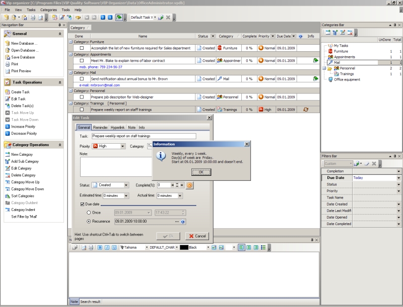 Office administrator should handle a lot of appointments, tasks and small projects. The software for office administrator should allow planning of Due dates for one-time or rarely performed tasks (such as "Send notification about annual bonus to Mr. Brown") and planning of recurring tasks (for example task "Prepare weekly report on staff trainings" that should be performed every week on Friday's morning). Moreover, it is important to range tasks by priority and set task reminders. |