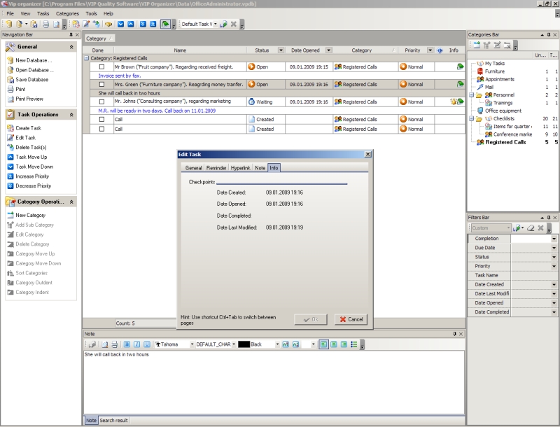 For effective organization of office administrator's work it is necessary to categorize tasks, in the way that fits his/her individual style of work. For example task "Prepare job description for Web-designer" can be referred to category "Personnel" and task "Accomplish the list of new furniture" can be referred to category "Furniture". Another software capability required by office administrator is keeping records on answered calls: caller's name, time when call was answered and notes about conversation (see screen-shot).
