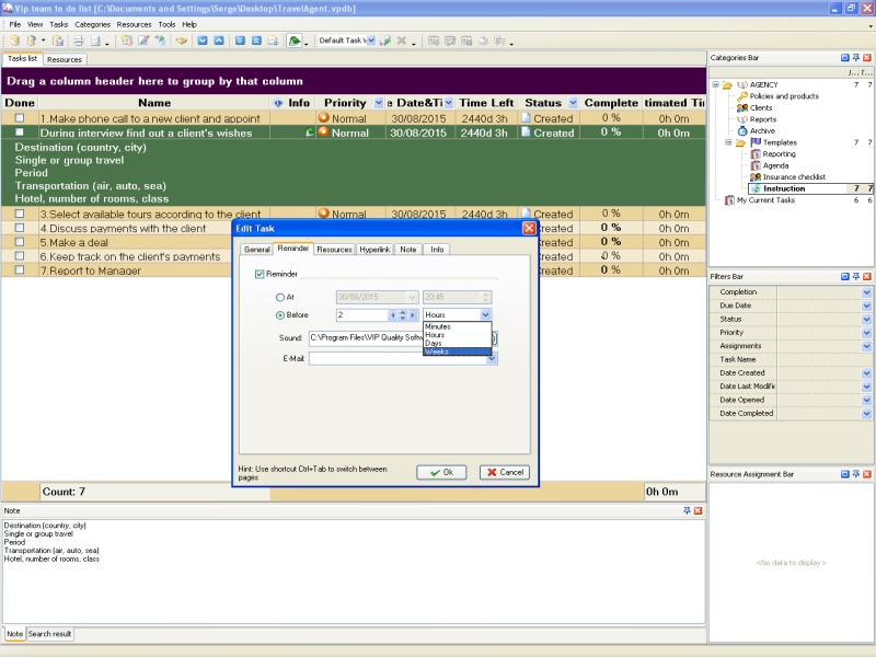 The workday of the travel agent usually is filled with a lot of various events such as appointments, phone calls, meetings, interviews, negotiations and other. In variety of these events the travel agent can miss some of them and forget important actions he should do. The travel agent can use task reminders in task management software to prevent himself from missed appointments, forgotten phone calls, procrastinated tasks and delays. He can set reminder for an event at precise date/time or some weeks/days/hours/minutes before it happens. In task management software reminders can be set for each task whether it is appointment, phone call, or some another action. The travel agent can send task reminder by email to one or several recipients.