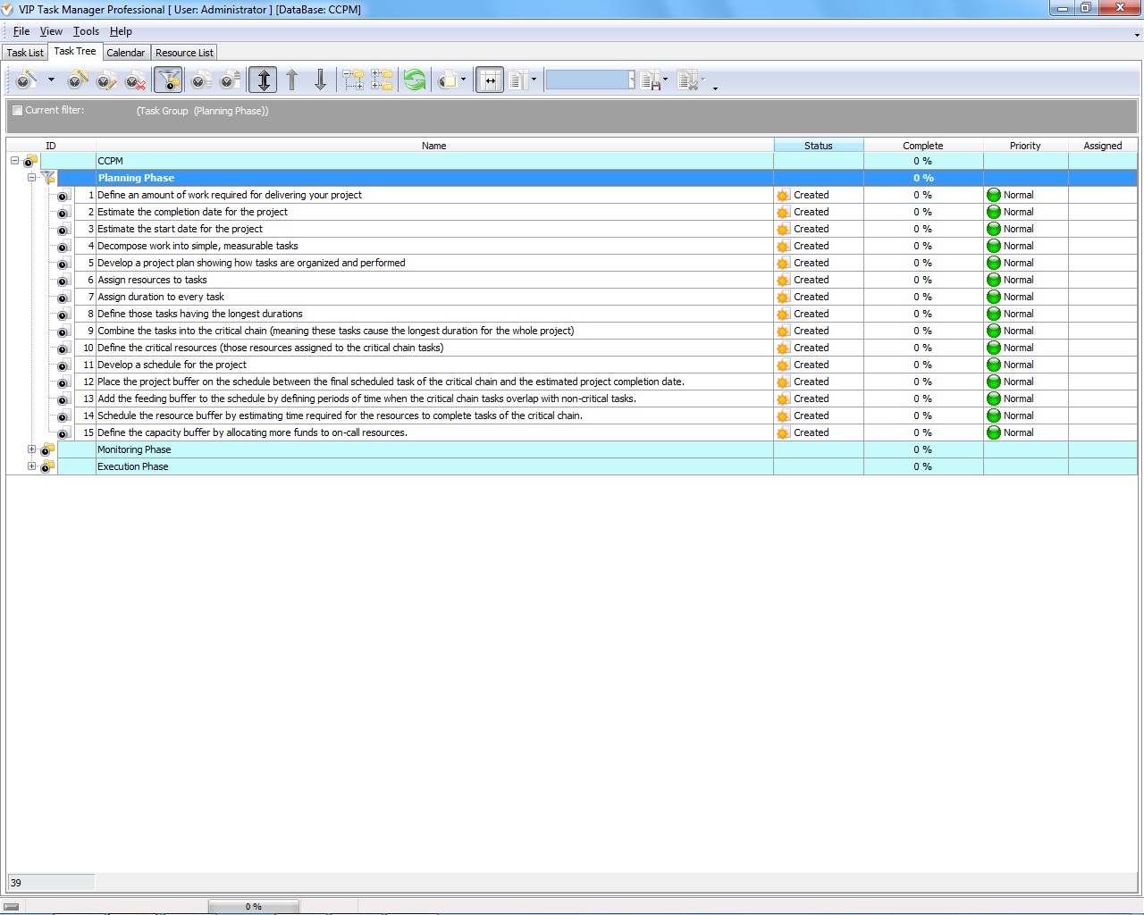 It is convenient to organize the process of buffer scheduling into a range of tasks by using VIP Task Manager. The software features Task Tree view that allows you to design a hierarchy of tasks and groups to plan the process. Below you can see sample tasks that describe the buffer scheduling process and the Planning Phase as well.