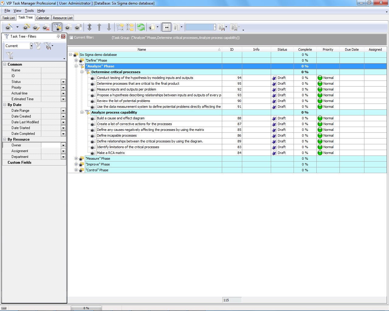 The best way to undertake these processes is to divide them into the smallest work items that are easier to measure and manage by your project team. As an example, you can use tasks and groups of tasks in VIP Task Manager to plan and carry out the two processes of the Analyze phase. We suggest using VIP Task Manager to manage tasks of your Six Sigma based project. Let’s explore the processes and find out how the software can be helpful for managing the phase.