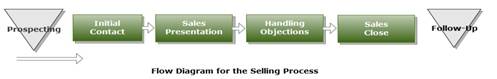 The second task is performed while considering results of the previous task. The team needs to design a flow diagram for analyzed processes. For example, such procedures as Prospecting, Initial contact, Presentation, Handling objections, Sales close, and Follow-up are included in the selling process. The team creates a flow diagram that represents the process boundaries (Prospecting and Follow-up) as triangles and the rest procedures are squares. Arrows between the components of the diagram are added to show the execution order and relationships (look at the picture below).